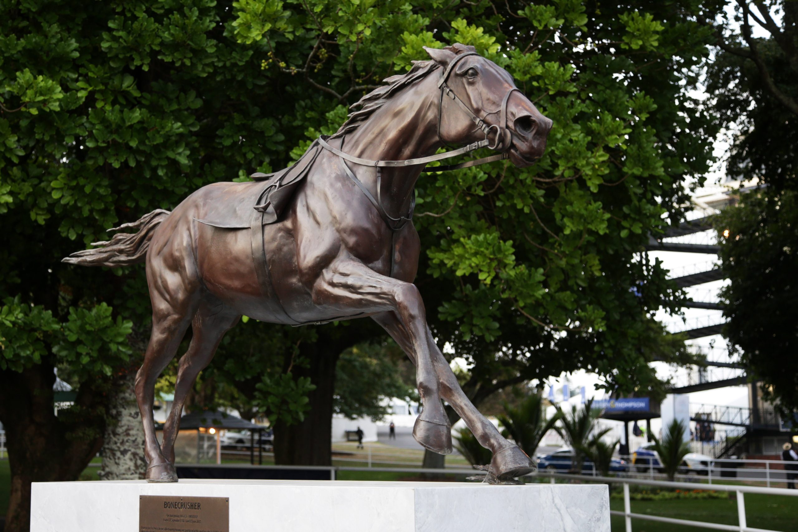Bonecrusher is forever remembered in New Zealand’s racing history, with a commemorative statue marking his final resting place at Ellerslie. The statue’s head looks towards horses as they enter the Parade Ring, wishing them all good luck for their upcoming race. | Image c/- Trish Dunell